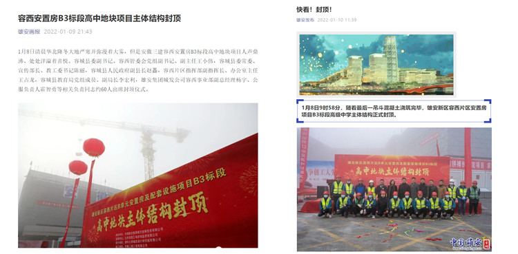 此外,人民雄安網(wǎng)《雄安容西片區(qū)高中封頂、未來可容納1920名學生》、新浪網(wǎng)《雄安新區(qū)容西片區(qū)B3標段高級中學主體結構封頂》、中國雄安官網(wǎng)《看建雄安丨容西片區(qū)B3標段高級中學主體結構封頂》以及河北日報報業(yè)集團、雄安發(fā)布、澎湃新聞等多家媒體官網(wǎng)、公眾號、微博客戶端對此次封頂儀式進行了宣傳報道,贏得點贊紛紛。