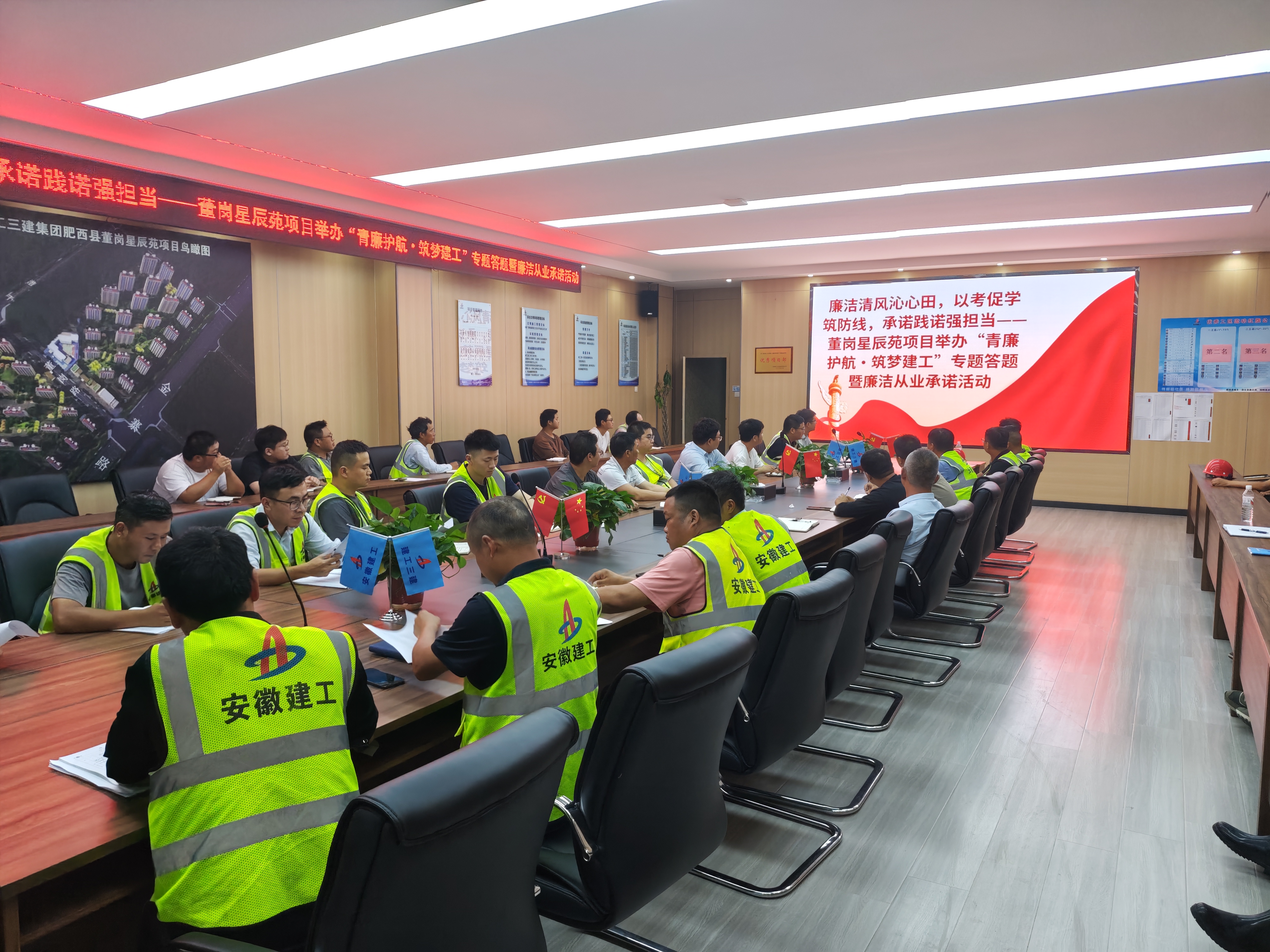 6月20日下午,董崗星辰苑項目部舉辦 “青廉護(hù)航?筑夢建工” 專題答題暨廉潔從業(yè)承諾活動,創(chuàng)新運(yùn)用“以考促學(xué)、以學(xué)促廉”模式,推動項目團(tuán)隊廉潔意識入腦入心、見行見效。