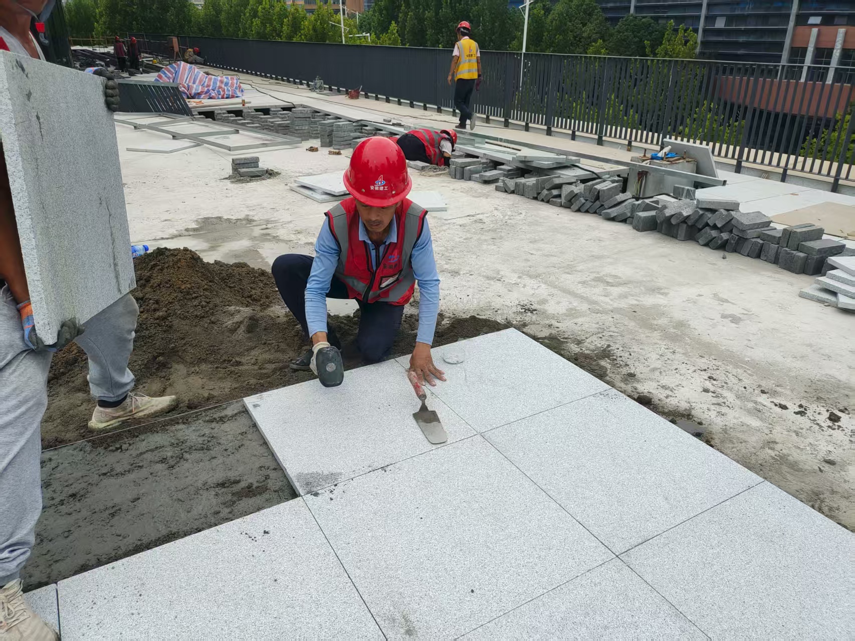活動當日上午10時,項目現(xiàn)場掀起“鋪磚技能競賽”高潮,8名工人在40-50平方米的標準化賽區(qū)內(nèi)展開激烈角逐,以“毫厘之間”的精準度詮釋新時代工匠精神。競賽現(xiàn)場,參賽工人們精神抖擻,紛紛亮出“看家本領(lǐng)”:從精準放線到規(guī)范取磚,從精細擺磚到嚴控磚縫,每個工序都展現(xiàn)出對“速度與質(zhì)量”的雙重追求。整場比賽在比學趕超中激發(fā)出大家“追求卓越、精益求精”的工匠熱情。