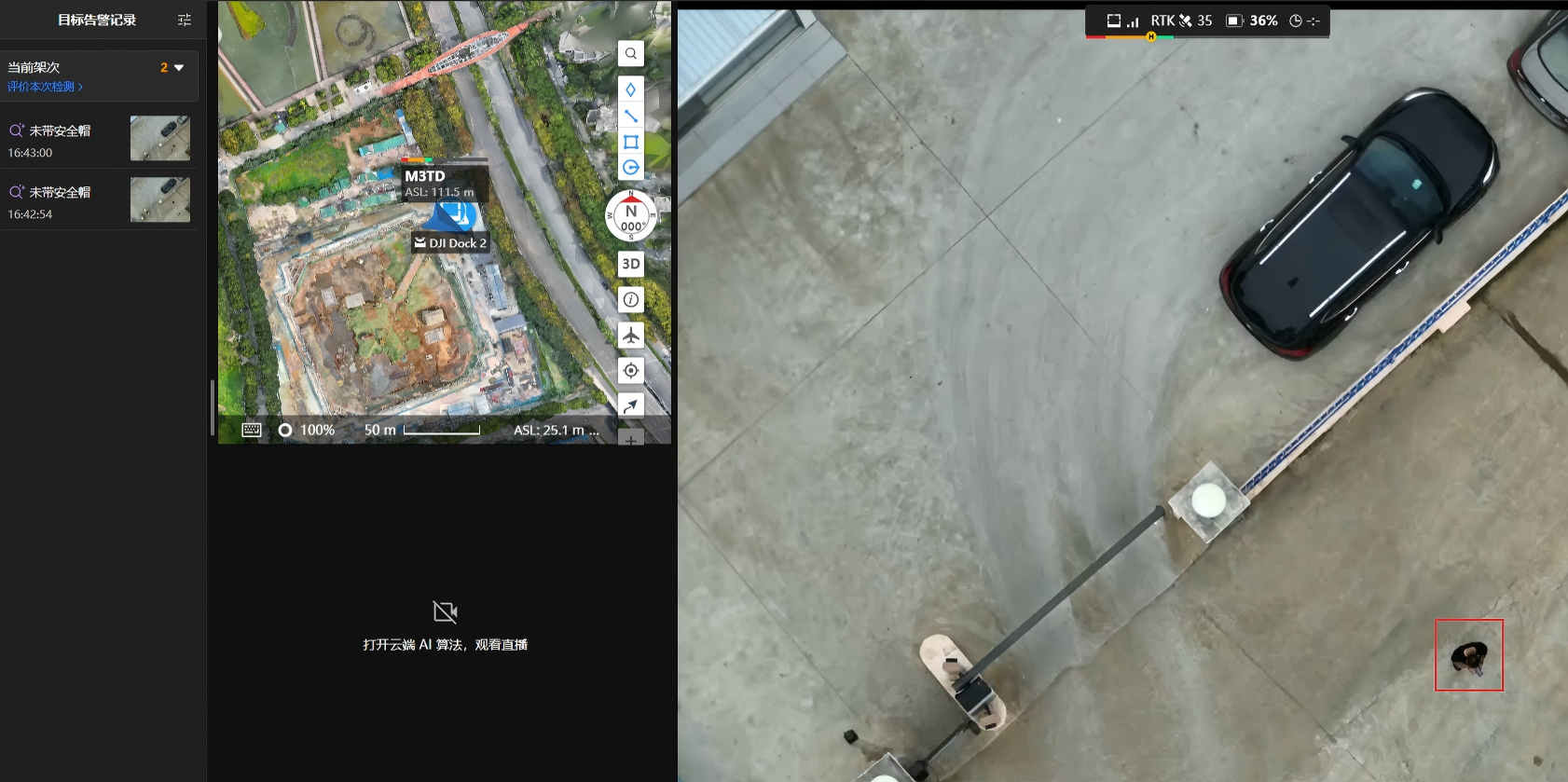 該項(xiàng)目部署具備定時(shí)自主飛行與實(shí)時(shí)傳輸能力的無(wú)人機(jī)機(jī)場(chǎng)系統(tǒng),結(jié)合AI算法引擎實(shí)現(xiàn)施工現(xiàn)場(chǎng)精度還原與目標(biāo)智能感知。在安全管理方面,無(wú)人機(jī)按預(yù)設(shè)航線自動(dòng)巡檢或遠(yuǎn)程操控,實(shí)時(shí)回傳畫(huà)面,AI大模型視覺(jué)算法可自動(dòng)識(shí)別未帶安全帽、臨邊區(qū)域等隱患,觸發(fā)告警并記錄目標(biāo)信息,助力管理人員快速排查處置,擴(kuò)大巡查范圍、縮短隱患處置時(shí)間,提升安全管理效率。